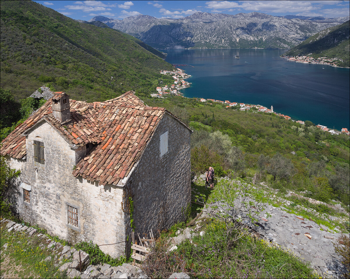 Мы залюбовались видом, открывающимся с площадки у подножия маленького храма — Святой Анны. Домик внизу под черепичной крышей, роскошный изгиб бухты и два городка напротив друг друга — Пераст и Доний Столив. Чудо-вид, тишина, безлюдье…