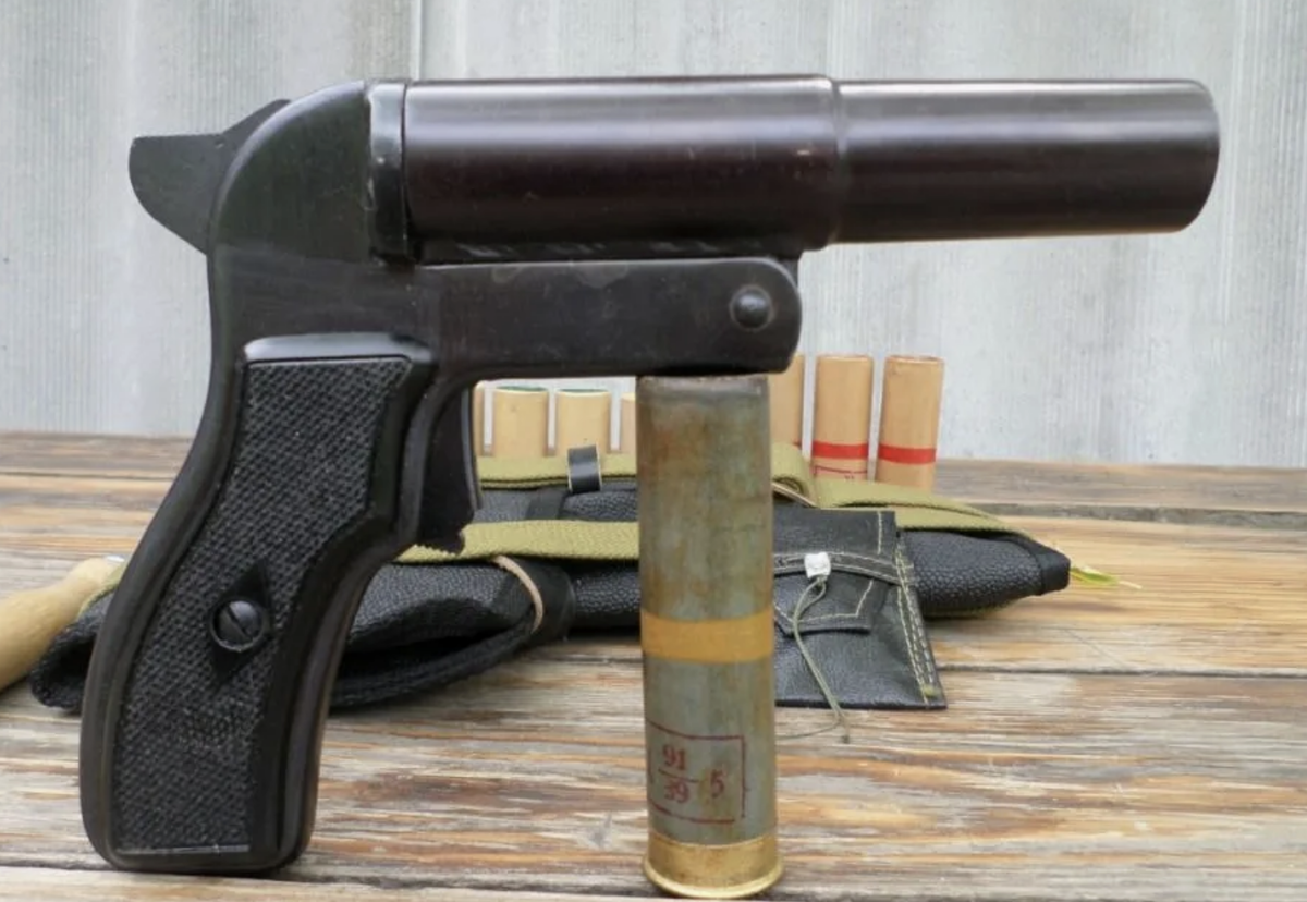 Сигнальный пистолет СПШ-44 был разработан в 1943-1944г оружейным конструктором Георгием Семеновичем Шпагиным. Основное назначение – подача световых сигналов в боевой обстановке, освещение секторов обстрела в ночное время. Конструкция пистолета состоит из 34 деталей, основная часть которых изготовлена методом холодной штамповки из листовой стали. Устройство и принцип работы схожи с механизмом гладкоствольного ружья-«переломки». Калибр ствола – 4 (26мм), длина – 150мм. В качестве боеприпаса применяются осветительные патроны, собранные на основе папковой гильзы. Функцию активного вещества выполняет дымный порох. Заряд представлен осветительными звездками различного цвета. Пистолет снаряжается по одному патрону. Для заряжания необходимо нажать фиксирующую защелку, расположенную на боковой задней части рамки, слева над рукоятью. Ударно-спусковой механизм куркового типа, одинарного действия. Боевая пружина витая, цилиндрической формы, расположена в полости рукояти. Для того, чтобы произвес