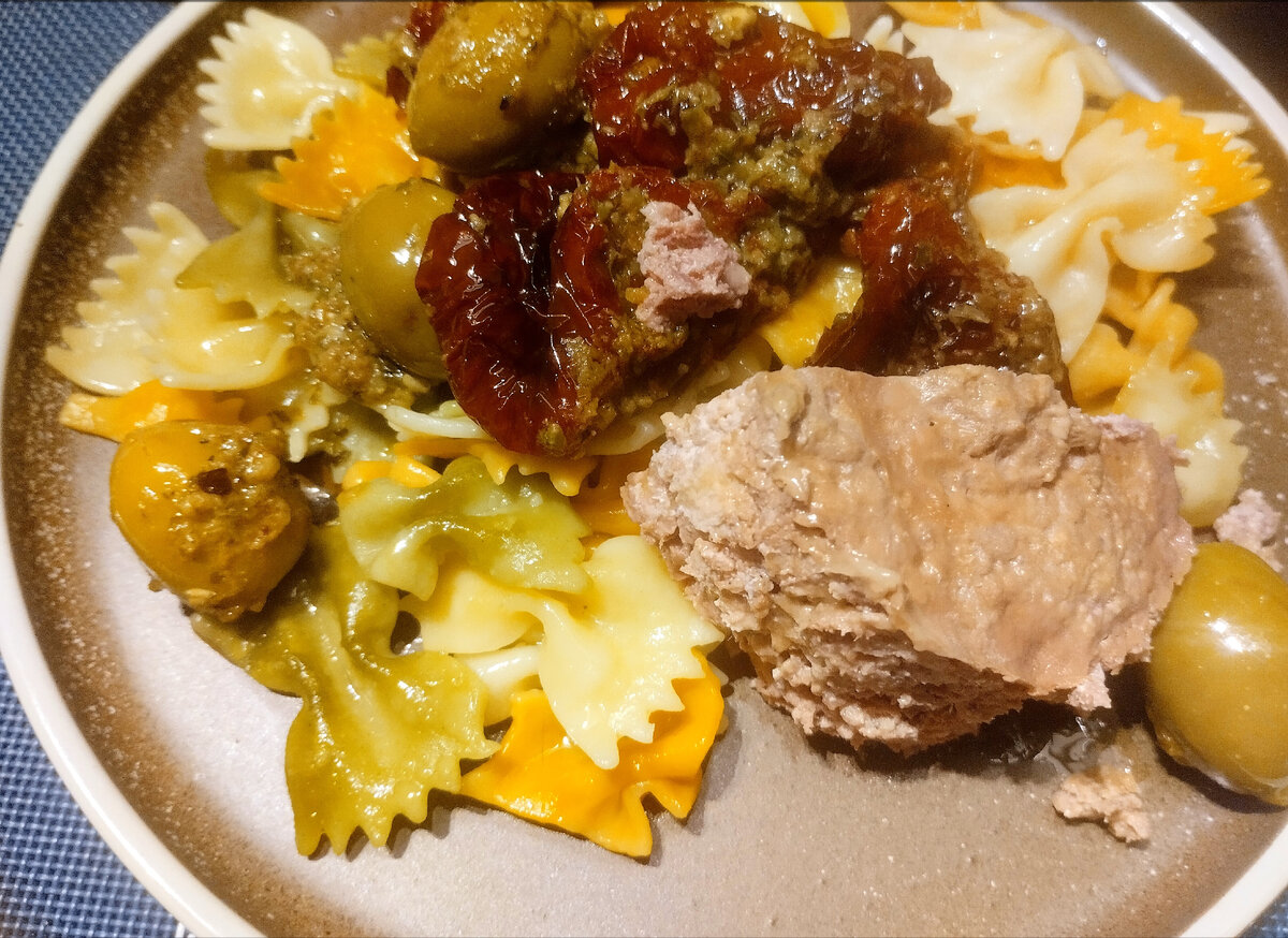 Блюдо необычное, вкус достаточно интересный, но не совсем мое. Песто с томатами в сочетании с пастой понравились, а вот оливки не люблю. Террин, конечно, не террин, а вкусный паштет.