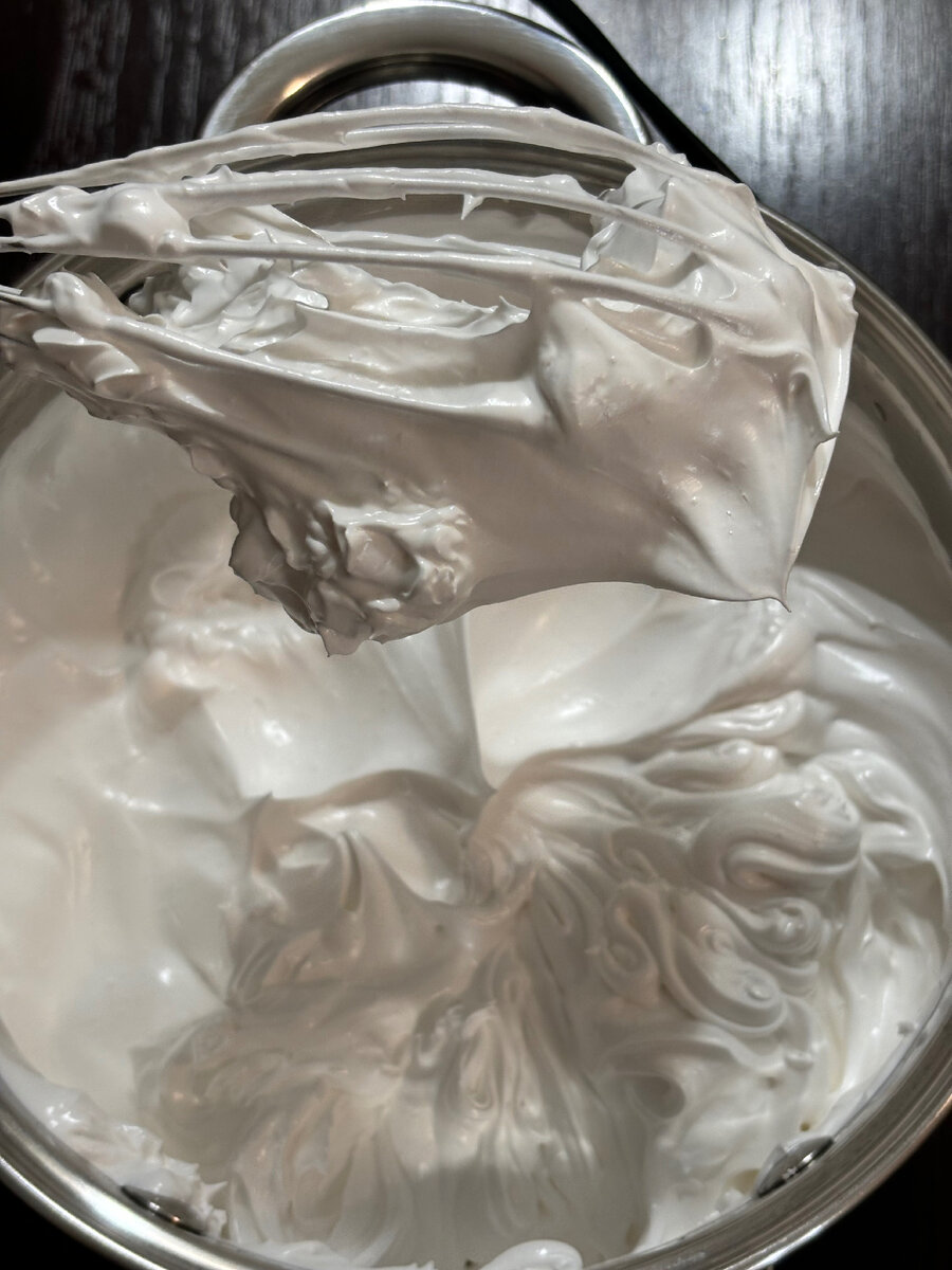 Для меренги нам понадобится : 1.200 граммов белка (6 яиц категории с1) 2.щепотка соли 3.300 граммов сахара 4.16 граммов яблочного уксуса 5.2 столовые ложки кукурузного крахмала Венчик и посуду, в которой будете взбивать , протереть уксусом. Яйцо тоже протереть уксусом( все хорошо обезжирить ) В емкость вливаем белок и щепотку соли, все взбиваем до легкой пены.Добавляем половину сахара и взбиваем до побеление массы, дальше вводим вторую половину сахара и взбиваем до полного растворения сахара (можно взять массу на палец и растереть , если чувствуются крупинки, значит сахар еще не растворился) Затем вводим яблочный уксус , вбиваем до плотных, устойчивых пиков Последним вводим кукурузный крахмал,перемешиваем силиконовой лопаткой очень аккуратно , чтобы не потерять пышность . Выкладывам меренгу на силиконизированный или бумагу , сверху посыпаем миндальными лепестками Ставим в разогретую духовку на 160 градусов, на 35 минут. Достаем готовую меренгу , перекладываем с противня на стол, дае