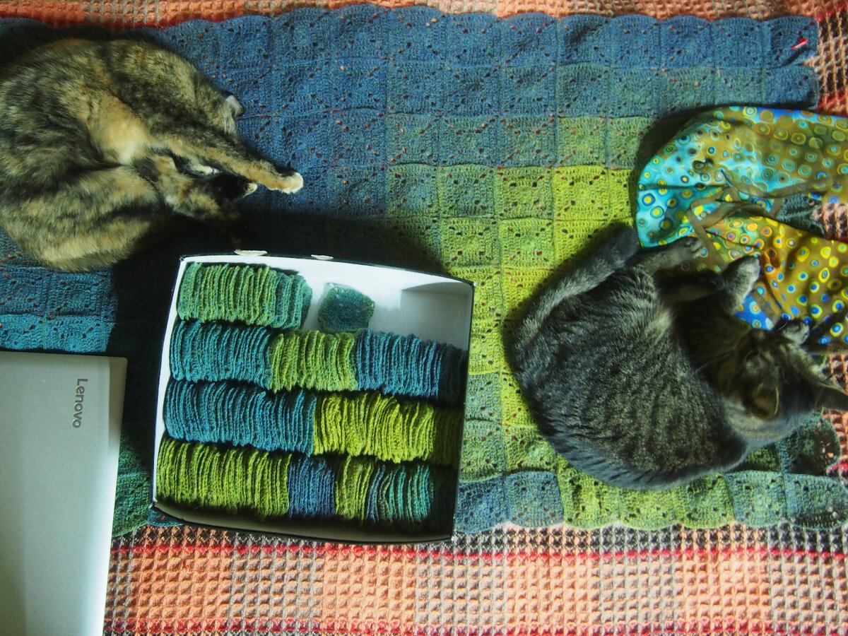 Даже не спрашивайте меня! Я честно попыталась продолжить сборку своего Вангогового пледа, но успела только разобрать готовые квадраты по оттенкам, чтобы понять масштабы бедствия в доведении пледа до узнаваемой картинки.