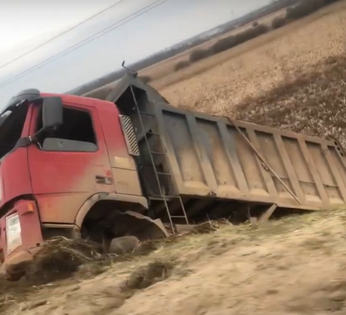 В соцсетях распространяется видео, на котором запечатлен помятый грузовик «Вольво». Лобовое стекло разбито. Машина лежит на боку