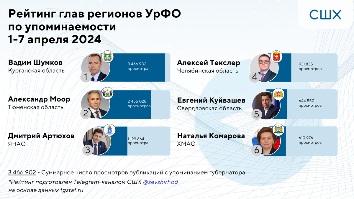 Первую строчку рейтинга упоминаемости глав регионов УрФО в Telegram за прошедшую неделю занял губернатор Курганской области Вадим Шумков с суммарным количеством просмотров 3 328 163 и 443 постами. Тема — прогнозируемый сложный паводок, который ожидают в 50 населенных пунктах региона уже в ближайшие несколько дней, а также беседа с Владимиром Путиным по этой теме.