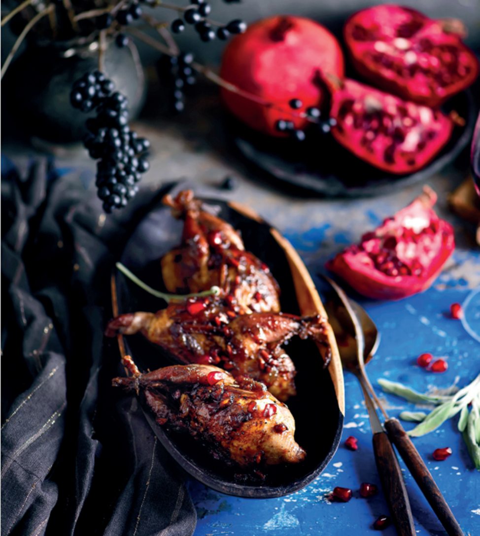 7. Когда перепела будут готовы, достаньте их из духовки и полейте оставшимся соусом. Переложите в тарелки и при подаче обязательно украсьте гранатом!