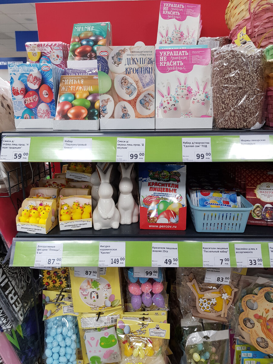 Здравствуйте, дорогие друзья! Сегодня свой обзор начну с товаров для Пасхи. Много уже было показано, немного ещё добавлю. Для тех, кто сам печёт куличи в продаже есть Формы пекарские бумажные, 4 штуки. Диаметр 11 см., высота 8,5 см. Легко и оригинально украсить Пасхальные яйца можно с помощью этого набора. Пасхальный набор Фаберже - 87 руб. Всё необходимое имеется в наборе, кроме, конечно, яиц, которые надо сварить. Инструкция на обратной стороне. Смеси для окрашивания пищевых продуктов в наборе Наши традиции - 59 руб. Красивое всё такое! Набор пасхальный для декорирования - 99 руб. Украшение в виде гнезда. Внутрь положить фигурки цыплят и яйца, прикрепить сбоку цветы. Или как - то по -другому, на ваше усмотрение. Подставка для яиц и кулича - 87 руб. Материал: фанера (берёза). Рисую по дереву. Пасхальные подвесы. Набор: деревянная раскраска - 199 руб. Материал: фанера (берёза). Смотрите, какие красивые салфетки я нашла. Подойдут для сервировки пасхального стола или изготовлени