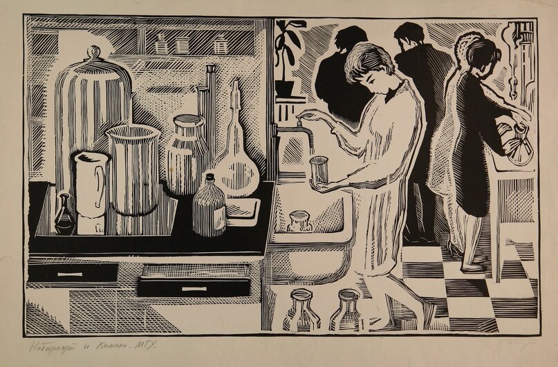 Мы продолжаем цикл публикаций, который посвящён 75-летию нашего химического предприятия. Помощниками при его подготовке стали коллеги — профессиональное сообщество «Идеи для музеев», а также выставочные центры, музеи и галереи, в чьих фондах хранятся произведения искусства, посвящённые науке, химии, лабораториям, учёным, школьным урокам химии, заводским цехам. Сегодня мы расскажем об одном из экспонатов Калужского музея изобразительных искусств. Работа «Натюрморт и химики» из серии «На химическом факультете МГУ» (бумага/гравюра на пластике) была создана Илларионом Владимировичем Голицыным в 1964 году. Левую половину композиции занимает изображение химической посуды, а справа – жанровая сцена со студентами, занятыми опытами.