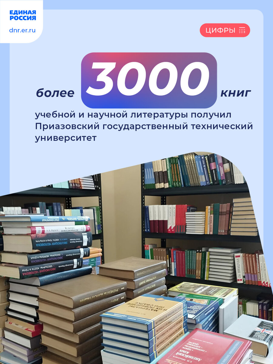 Ценный дар для научно-технической библиотеки вуза передали коллеги и города на Неве: Санкт-Петербургский государственный университет и Санкт-Петербургский государственный архитектурно-строительный университет. «Библиотека университета пополнилась книгами по высшей математике, физике, химии, строительству и архитектуре, информационным технологиям, истории, социологии и психологии, экономике и менеджменту, языкознанию и литературоведению. Это очень поможет нашим студентам в освоении учебных дисциплин. Спасибо за поддержку!» – сказала заместитель Председателя Правительства ДНР Лариса Толстыкина. #ЕРДНР #ХорошиеНовости #ЕдинаяРоссия