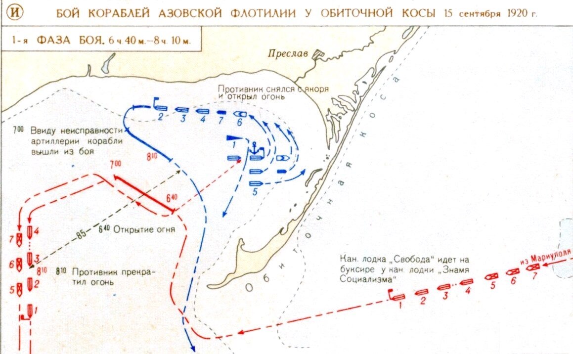 Крым являлся последним оплотом "белой" армии, но осенью 1920 года Красная армия начала наступление. Морской бой у Обиточной косы случился 15 сентября1920 года, после того, как белый отряд обстрелял Бердянск. Красная флотилия начала преследование. 15 сентября в 6:40 с дистанции в 40 каб (по-сухопутному, 7,4 км) произошла первая перестрелка, не совсем удачная для красной флотилии. Из-за неудачной установки и изношенности вышли из строя два орудия.