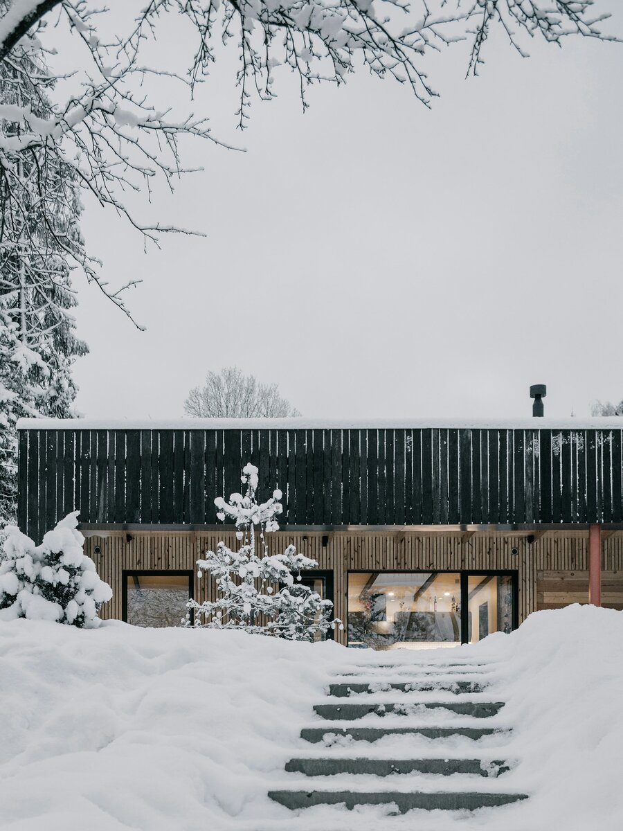 Местоположение проекта: Россия Баня расположена на краю участка, который занимает северный склон холма, с видом на озеро. Все комнаты выходят окнами на участок, за исключением кухни, которая расположена в задней части и освещается мансардным окном. Фасад бани обшит потемневшими деревянными досками, в то время как внутренние поверхности, включая стены гостиной, обшиты деревом в светлом оттенке. Сдержанную цветовую палитру дома-бани дополняет металлическая колонна, окрашенная в красный цвет.