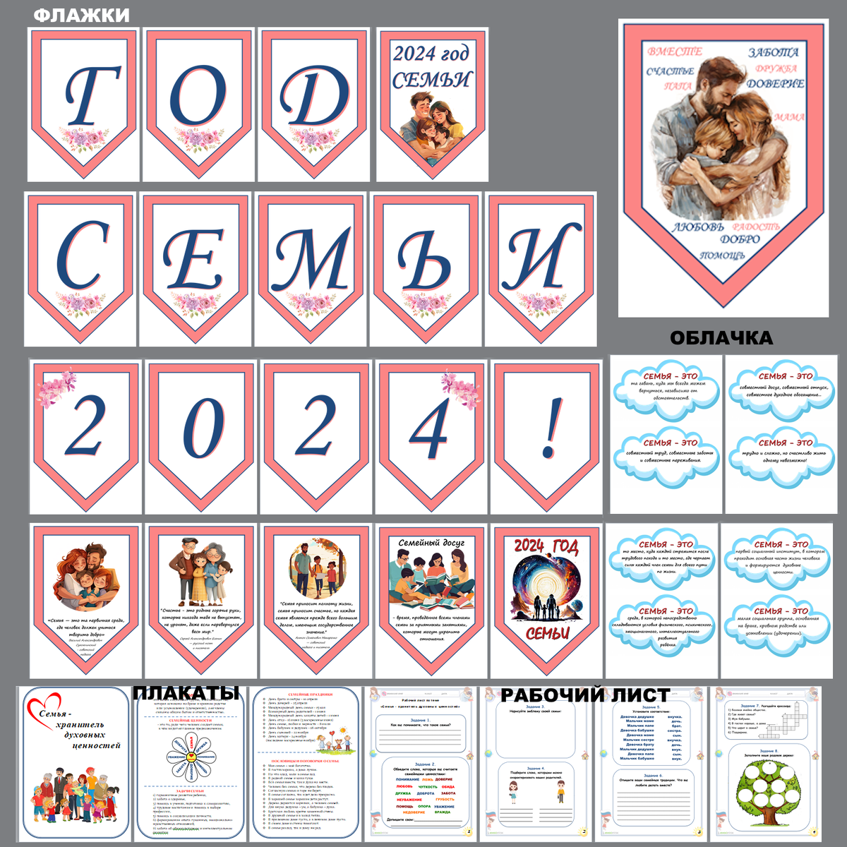 Рабочий лист + плакаты + флажки+облачка на тему "Семья — хранитель духовных ценностей" и "2024 год семьи"