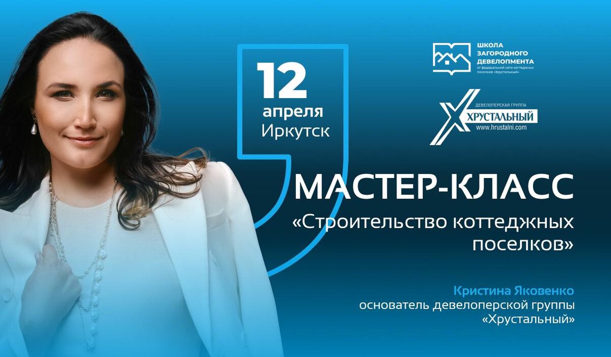 12 апреля в Иркутске от школы загородного девелопмента «Хрустальный» состоится увлекательный Мастер-Класс «Строительство коттеджных поселков». Школа загородного девелопмента играет ключевую роль в структуре девелоперской группы "Хрустальный", где обучаются не только сотрудники, но и другие девелоперы. А также, двери школы открыты для новых партнеров с целью расширения сети. Главная цель школы - делиться опытом успешной реализации загородных проектов, чтобы помочь избегать ошибок и обеспечить высокое качество проектов по всей России. На мастер-классе сильнейшие спикеры поделятся опытом и знаниями по строительству коттеджных поселков: Программа мастер-класса включает в себя три части: - подбор участка - реализация проекта - практические занятия по созданию концепции. Мероприятие будет интересно всем, кто работает или планирует работать в области строительства и развития коттеджных поселков. По окончании мастер-класса участники смогут презентовать свои проекты перед экспертами-девелоперам