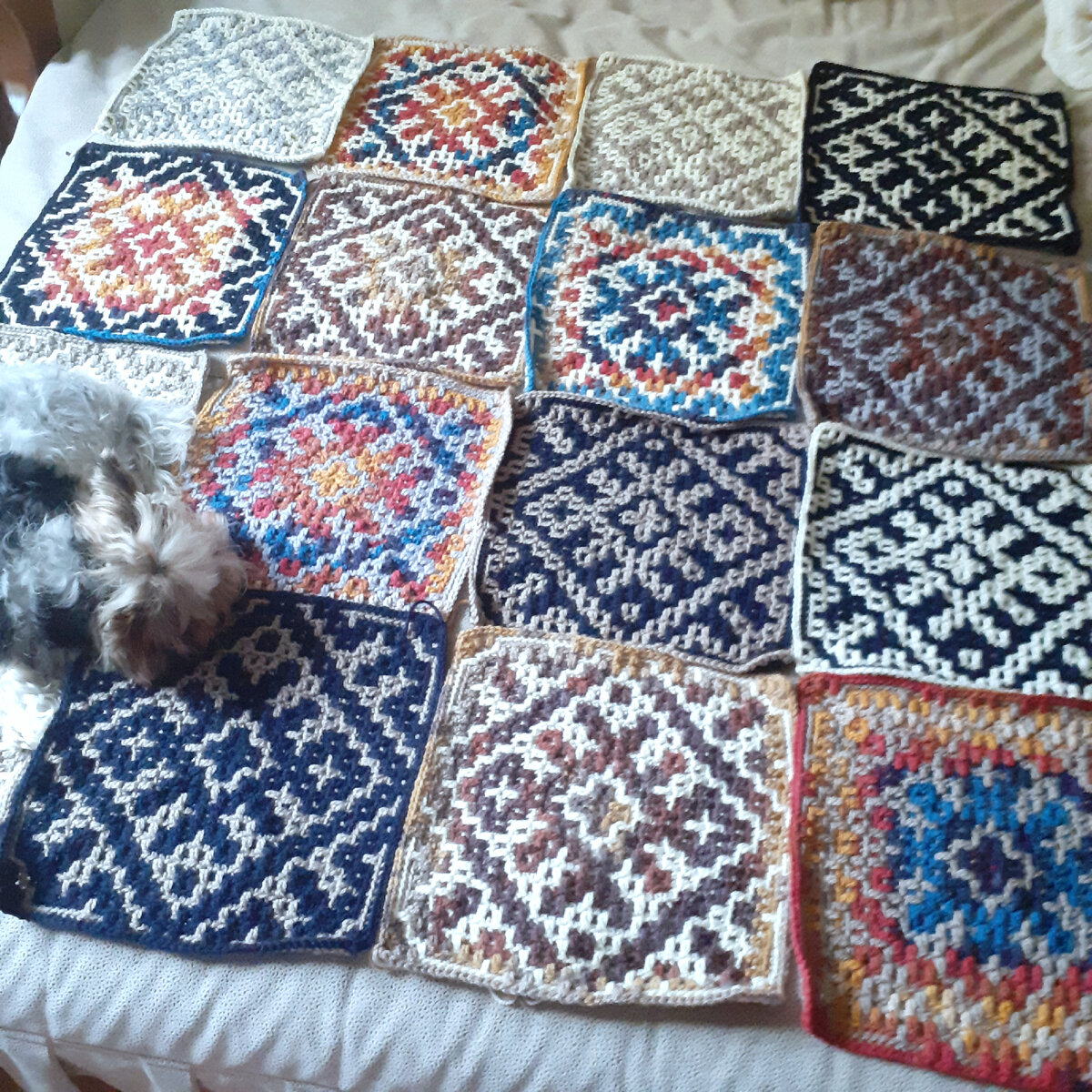 Без проекта и из того, что было. Что это, как не вязание вслепую? Вот и я не устояла перед искушением связать плед из мозаичных квадратиков в чате Юлии Гендиной. Проект называется: "Квадрат в день". Техника мозаичного вязания крючком. Схема простая, хотя и ассиметричная. Можно вязать зеркальные квадраты, тогда узор пледа получится двухсторонним. Впрочем, и пряжи нужно больше. Не знаю почему, но что-то отталкивает меня от отзеркаливания. Хотя и соглашусь, что красиво. Когда-нибудь попробую обязательно. Пряжа Использую остатки от пледов, подушек турецкой Ализе Буркум Класик и Батик (100г/210м, 100% акрил). Замечу, что остатки эти в виде полных или почти полных моточков. Двух контрастных мотков хватает на два мотива 30х30 см. Впрочем, в некоторых квадратах есть и более мелкие остатки. Приходилось ввязывать нить. Кстати, знаю очень хороший способ, без узелков. Однажды даже видео сняла. Но просто невозможно сдержать эмоции, когда нити не хватает до окончания на одну сторону квадрата. В так
