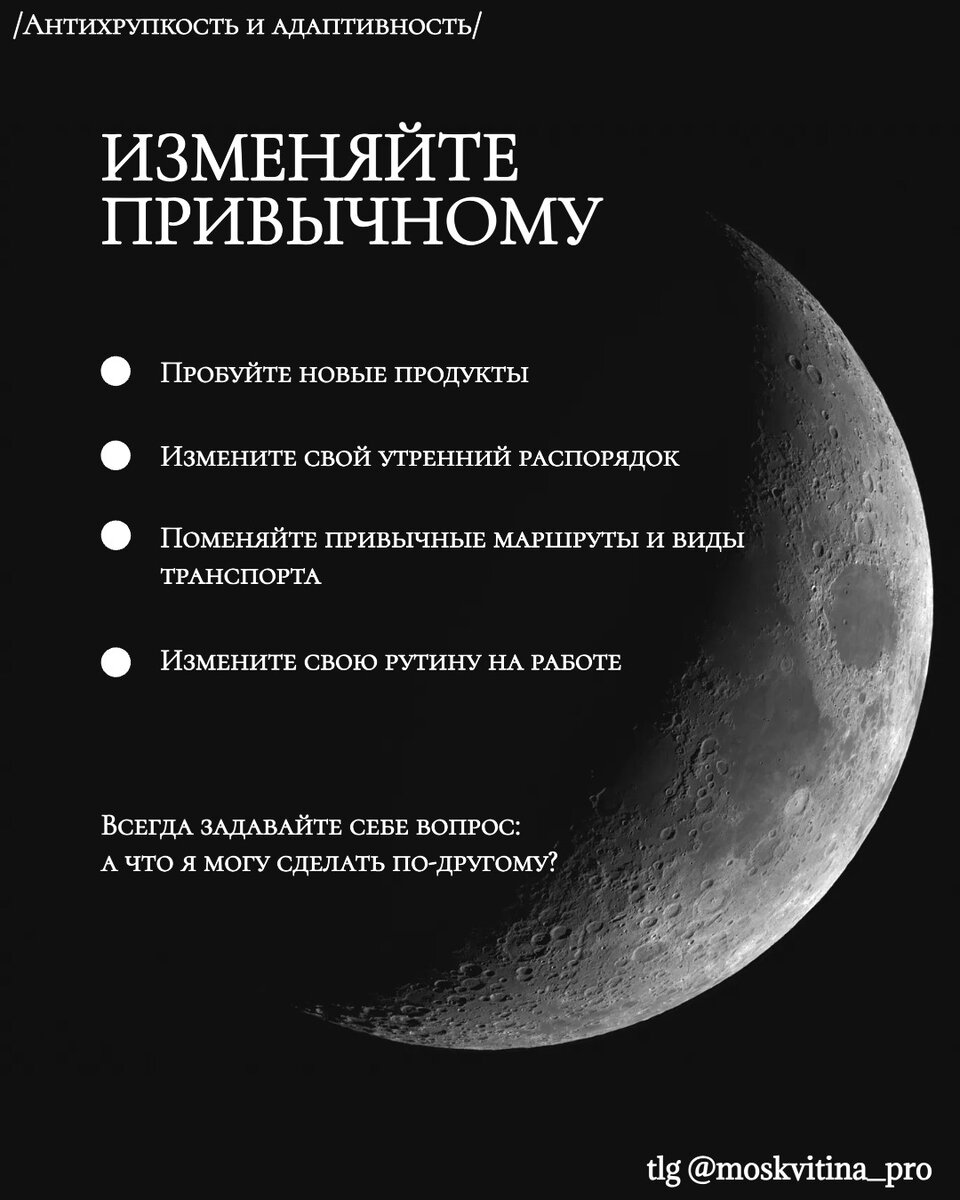 Последние 1,5 года моей жизни - это не выход из зоны комфорта, как я раньше думала, а тренировка моей личной адаптивности и антихрупкости. Когда пришлось менять "жизнь мечты" на неизвестность, у меня было страшнейшее отрицание. Ну как так, думала я, только наконец доросла до хорошего уровня, все есть, дальше только усиливать свою экспертность и управленческие навыки, повышать чеки и пухнуть от радости и удовольствия. Но жизнь подкинула черного лебедя. Я отрицала очевидные обстоятельства, пыталась принимать решения, используя традиционные для меня подходы, и это тянуло меня вниз. Я была хрупка - изменения причиняли мне вред, разрушали мою систему координат. 〰️〰️〰️〰️〰️〰️〰️ Волатильность, изменчивость и хаос как подарок жизни для личностного роста Осознание того, какой оказывается большой подарок мне преподнесла жизнь, пришло совсем недавно - после прочтения книги Антихрупкость Нассима Талеба. Спасибо нашему другу Руслану, который пришел в гости и почти с порога сказал революционную для