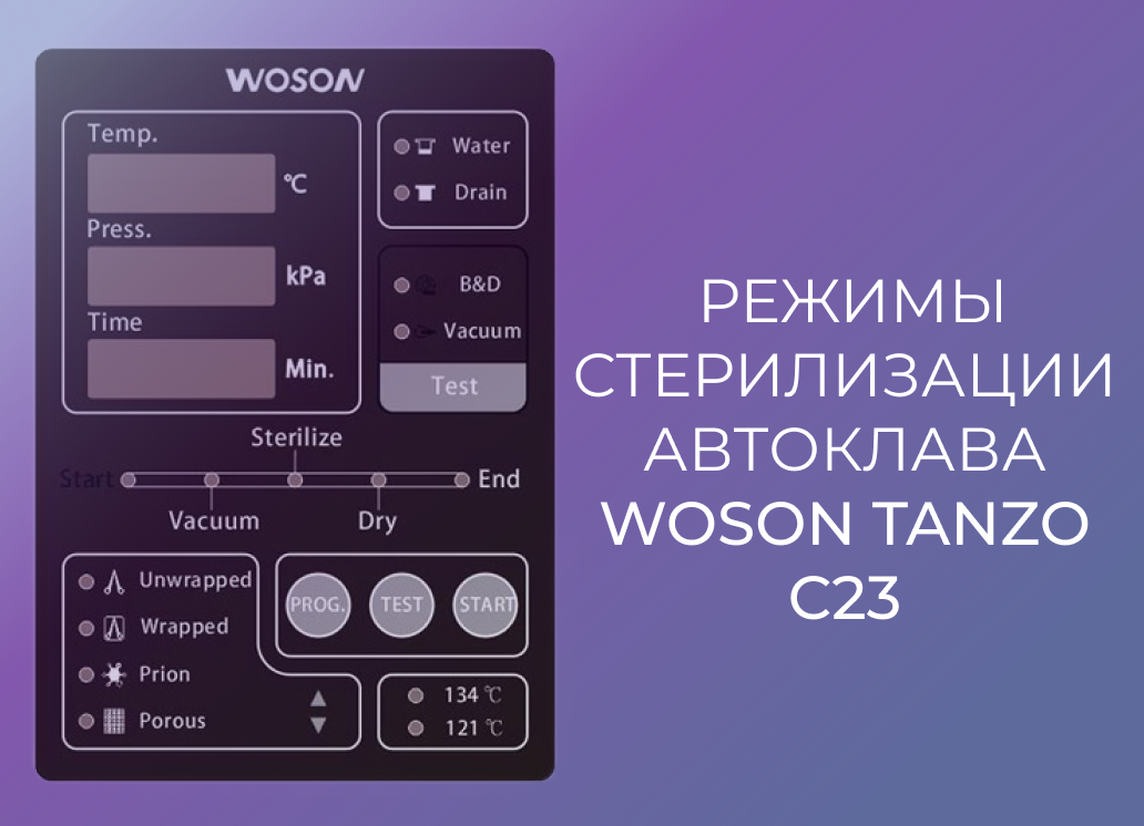 Мы уже рассказывали вам об особенностях и преимуществах стерилизации с помощью автоклава: Сегодня, мы предлагаем вам познакомиться поближе с моделью автоклава WOSON TANZO C23 и его режимами работы. Перед началом использования мы рекомендуем подробно ознакомиться с инструкцией по использованию прибора! При использовании автоклава используется ТОЛЬКО дистиллированная вода, температуры не ниже 40℃. Данный автоклав имеет класс стерилизации В, соответственно вы можете подвергать обработке все инструменты сложной формы и конструкции, в том числе стоматологические и хирургические материалы, а также пористые. Выбор программы производится с помощью нажатия кнопки PROG. Существуют три основных цикла стерилизации: В автоклавах TANZO C предусмотрены также режимы для стерилизации упакованных и неупакованных инструментов, важно это учитывать, поскольку неупакованные стерильные инструменты предназначены для немедленного использования или нестерильного хранения, транспортирования или применения. Для э