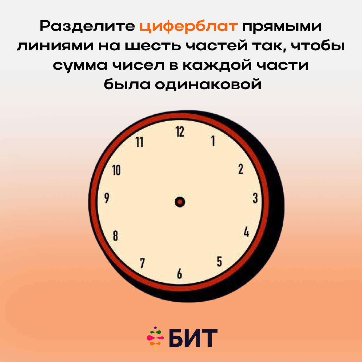 Как разделить циферблат на 6 частей прямыми линиями так, чтобы сумма чисел в каждой части была одинаковой?