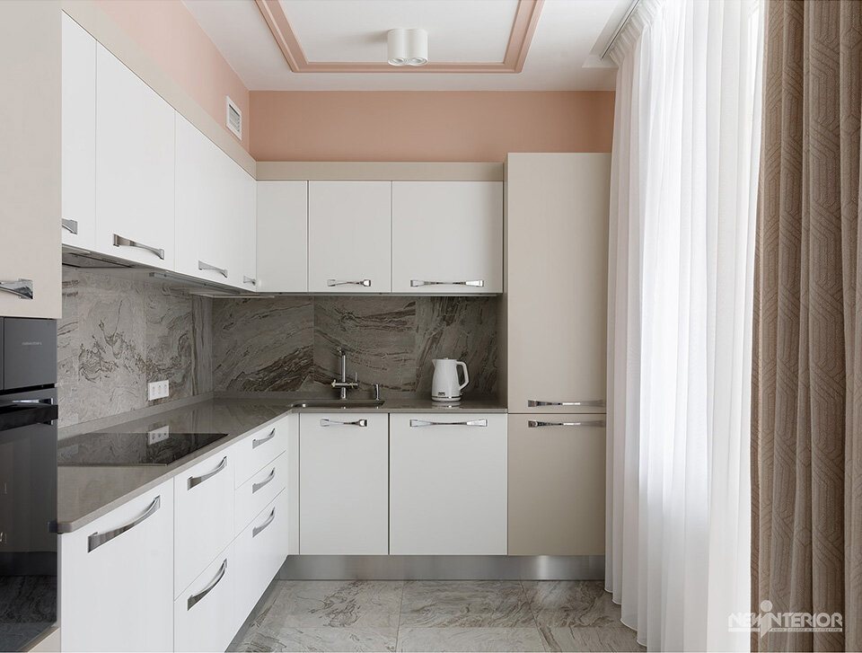 На этих фотографиях вы видите завершённый интерьер кухни в нашем проекте квартиры, которая расположена в ЖК Времена года в Санкт-Петербурге. Кухня L-образная с матовыми фасадами в двух цветах: в центральной части они выполнены в белом цвете, а колонны по бокам бежевые. Верхние шкафчики не доходят до потолка, это пожелание заказчиков. Тем не менее над ними мы зашили стену с глубиной меньше чем эти шкафчики, таким образом, мы смогли спрятать гофру вытяжки, не нарушив визуальную композицию кухни. Ручки на фасадах этой итальянской кухни в хроме, и чтобы достичь большей визуальной гармонии, мы выбрали оформление цоколя в металлизированной отделке. Обратите внимание, что фартук кухни выполнен из того же керамогранита, что и пол. Таких решений не стоит бояться, выглядит это красиво и если выбрать качественные материалы с хорошей имитацией мрамора, то картинка сложится. Полный румтур по квартире смотрите на нашем канале YouTube.