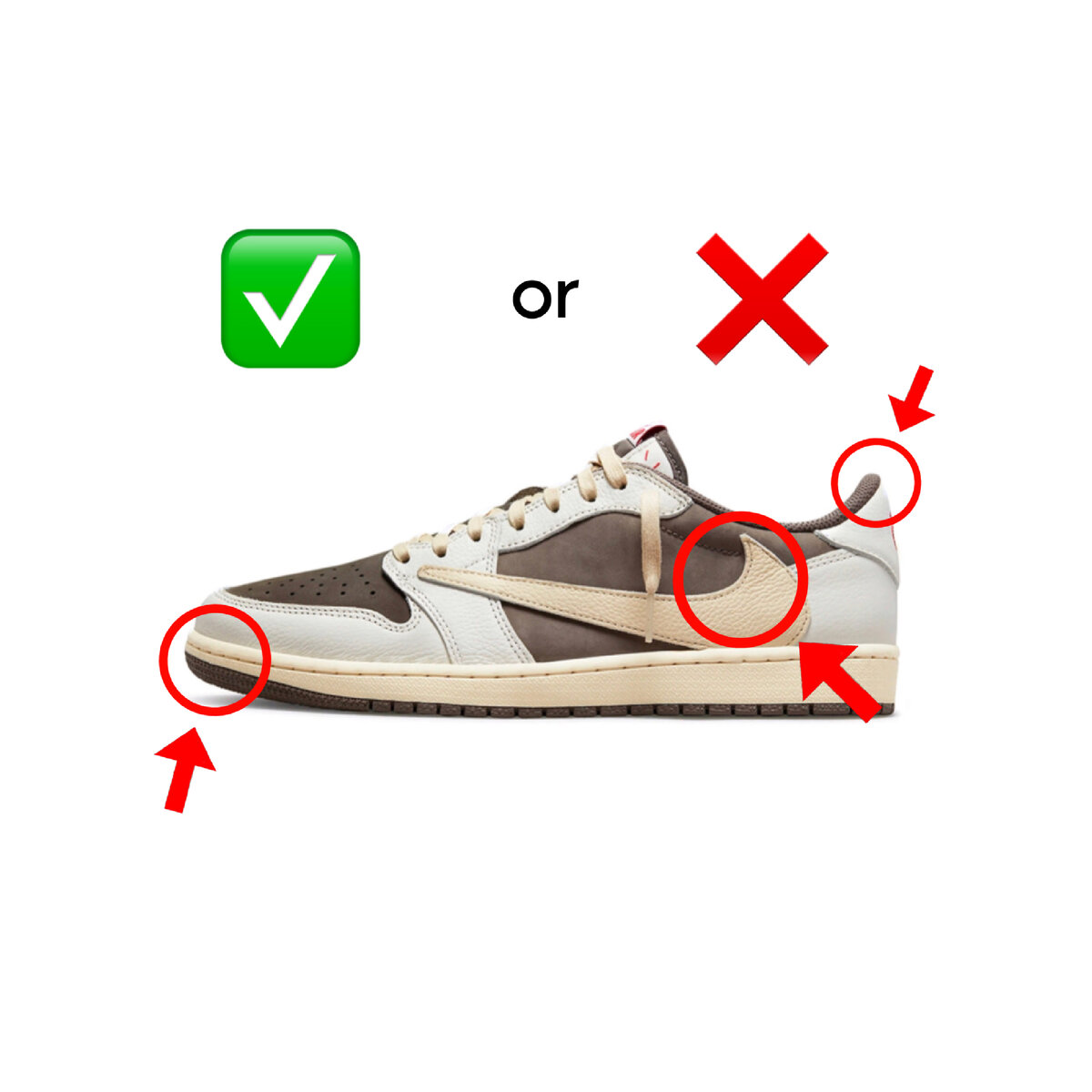 Рассмотрим на примере Nike Jordan 1 Low Travis Scott Reverse Mocha 1.Язычок ✅Оригинал: 1.Текст «SWOOSH» вверху имеет правильную толщину и содержит пропорциональные буквы «OO». 2.Средний текст «SWOOSH®» состоит из букв «S» и «W» соответствующего размера. 3.Текст «VOTRE» в левом нижнем углу имеет правильный размер и толщину. Подделка: 1.Текст «SWOOSH» вверху слишком толстый, Буквы «OO» кажутся слишком маленькими. 2.Средний текст «SWOOSH®» состоит из увеличенных букв «S» и «W». 3.Текст «VOTRE» в левом нижнем углу слишком большой и слишком толстый. 2.Носовая перфорация ✅Оригинал: 1.Коричневая замша имеет разные оттенки; некоторые области кажутся темнее других. 2.На настоящей замше при прикосновении видны следы и изменения текстуры. ❌Подделка: 1.Коричневая замша выглядит статичной, имеет одинаковый оттенок на носке и по всей обуви. 2.Не хватает сложной детализации и динамических изменений текстуры, характерных для натуральной замши. 3.Нос кроссовка ✅Оригинал: 1.Нос имеет более выраженный и