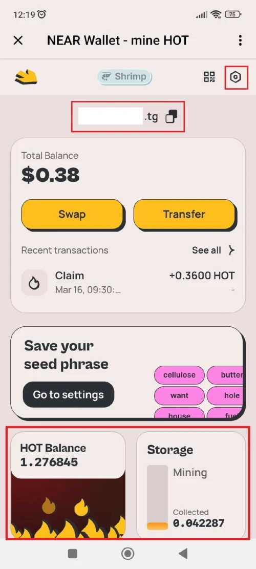 3. В верхней части экрана вы увидите адрес вашего кошелька, который заканчивается на .tg. Нажмите на шестеренку в правом верхнем углу, чтобы перейти в настройки вашего аккаунта и сохраните вашу seed-фразу в безопасном месте.