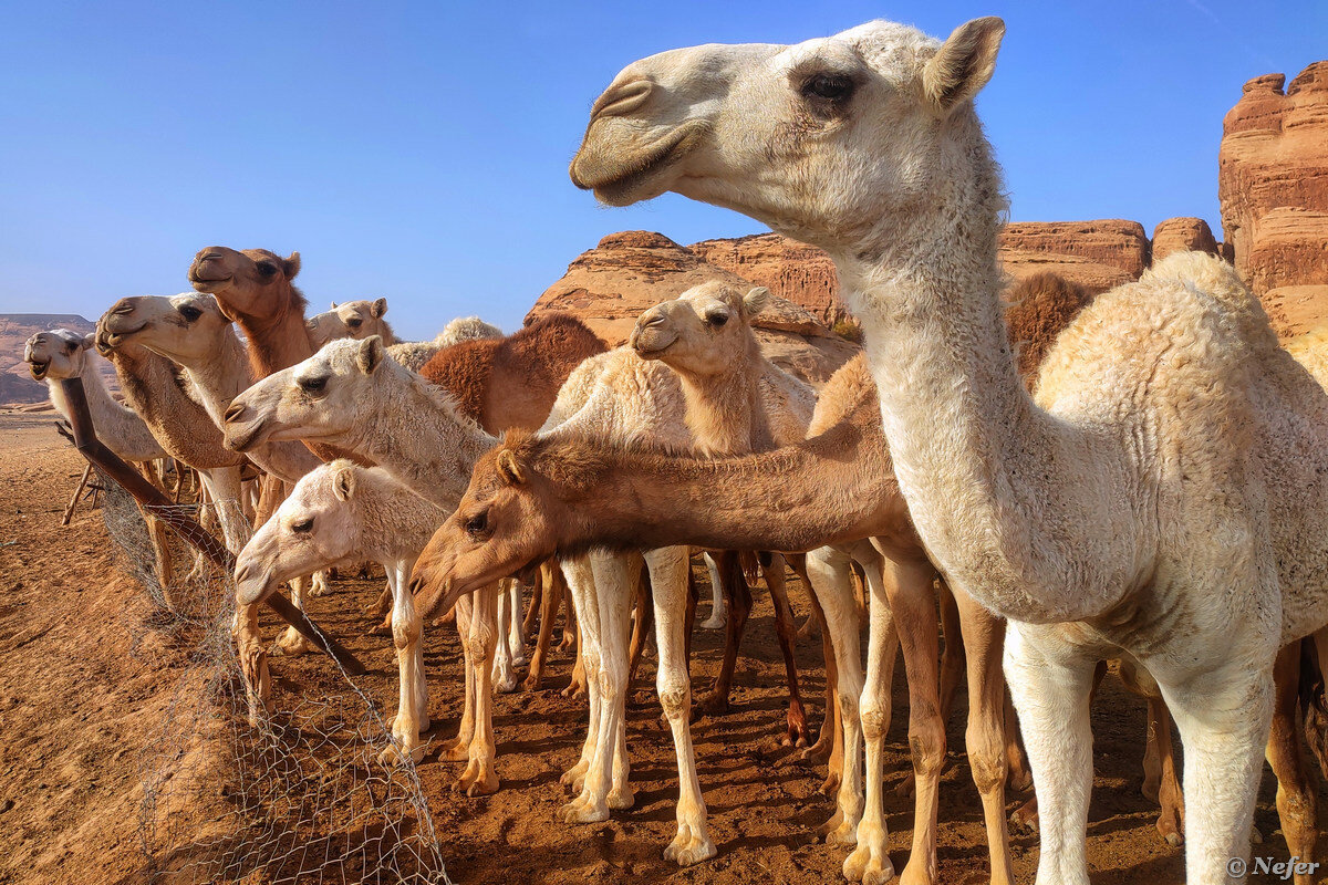 В пустыне недалеко от городка Аль-Ула есть причудливое скальное образование, на картах Google локация отмечена как Rainbow Arch, то есть Радужная Арка. Мы решили, что заедем к ней быстренько утром и двинемся дальше по маршруту. Но все оказалось не так, как было запланировано. Как только съезжаешь с трассы, практически сразу пропадает интернет. В таких случаях выручает заранее скачанная карта. Дорога грунтовая. На самом деле ее нет, есть направление - следы от предыдущих автомобилей. Куда ехать непонятно. Если двигаться прямо на отмеченную точку, упираешься в скалу и какое-то хозяйство, типа ферма что ли. Стали объезжать вокруг, наткнулись на верблюдов. Представляете, целый загон, битком набитый верблюдами! Все разные: коричневые, темные, светлые, большие, маленькие. В стаде свои взаимоотношения, одни трутся друг о друга, у других разборки с покусами. Остановились их пофотографировать. Животных заинтересовали две странные девахи. Они бросили свои дела и пришли к ограждению посмотреть на