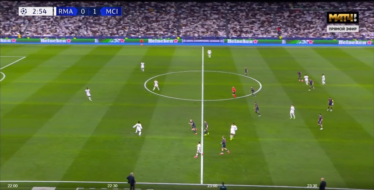 Рисунок на игру Реала весьма прост: создать управляемый хаус, а точнее сказать, управляемое броуновское движение, в котором Карвахаль играет и защитника, и вингера, и центрального нападающего. Камавинга играл и опорника, и вингера. Винисиус сыграл везде в нападении. Я удивлён, что никто перчатки у Лунина не отобрал. В то же время у Сити не было игры, которая сломала бы рисунок Реала. Более того, рисунок Реала заставил Сити адаптироваться и чем-то отвечать, при этом не забывать о центральном нападающем Винисиусе, но есть нюанс: Винисиус отдал инициативу и не играл центрального нападающего. Он даже по углам не бил в первом тайме. Сити сделал максимум хауса, на который способен - Стоунс иногда подключался в атаку. Характеризует хаус Реала скрин ниже.
