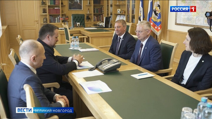Сегодня пресс-служба Новгородского правительства предоставила "Вестям" кадры первой рабочей встречи губернатора Андрея Никитина с недавно назначенным на пост председателя Северо-Западного банка СберБанка Дмитрием Суховерховым. Сообщается, что были обсуждены вопросы взаимодействия и перспективные направления сотрудничества. В частности, обговорили старт производства умных телевизоров Sber на территории особой экономической зоны "Новгородская" и строительство кампуса Новгородского Государственного университета.