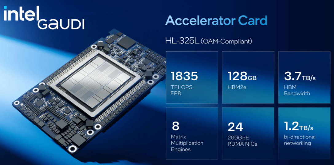 На выставке Vision 2024 компания Intel приоткрыла завесу тайны над Gaudi3, своим ускорителем нового поколения, сочетающим в себе два 5-нм кристалла производства TSMC. Чип может похвастаться впечатляющими характеристиками: 64 тензорных ядра 5-го поколения, 128 ГБ памяти HBM2w и мощность в 900 Вт. Gaudi3 пришел на смену Gaudi2, разработанному Habana Labs, которую Intel приобрела пять лет назад. Количество тензорных ядер увеличилось с 24 на Gaudi2 до объединения двух 32-ядерных чипов в Gaudi3. Каждый чип имеет 48 МБ SRAM-памяти, всего 96 МБ на весь пакет. Сама память SRAM имеет пропускную способность 12,8 ТБ/с и поддерживается памятью HBM2e, но с более высокой общей пропускной способностью 3,7 ТБ/с по сравнению с 2,45 ТБ/с у Gaudi2. Кроме того, полная емкость, как сказано выше, увеличилась с 96 ГБ до 128 ГБ. Для варианта форм-фактора PCIe (HL388) Gaudi3 также использует интерфейс PCI Express 5.0 на всех 16 линиях. Согласно имеющейся информации эта версия имеет TDP 600 Вт, что редко встреч