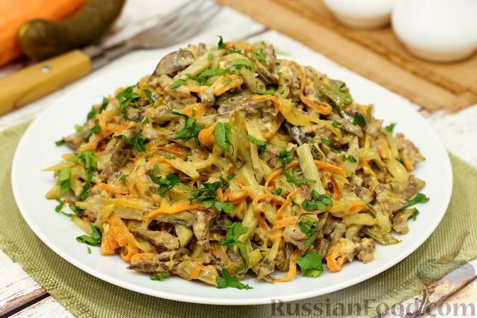 Салат с куриной печенью, морковью и солёными огурцами. Удачное сочетание продуктов – жареная печень, солёные или маринованные огурцы и большое количество лука, обжаренного с морковью. Салат не оставит равнодушными любителей простых и сытных блюд.