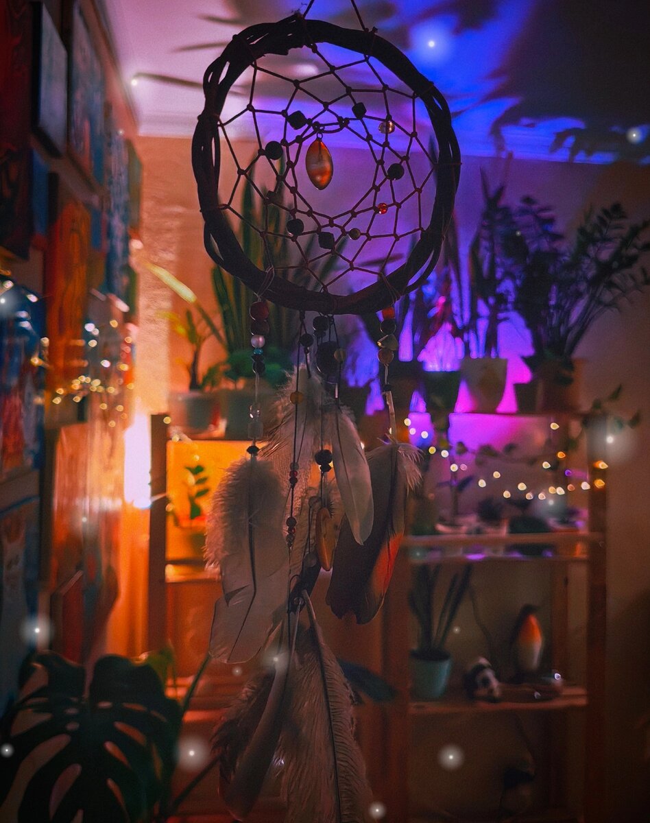 Мы все любим подарки, а подарки с индивидуальным подходом так еще больше. Если выщь вызвала волну эмоций, значит его подобрали с учетом интересов, значит человек действительно старался, думал, подбирал. Именно такой такую вещь мне подарили. Это был ловец снов ручной работы с натуральными камнями и из настоящей ивы. Все по правилам. Волшебство. Я повесила его в своем творческом уголке. Он прекрасно вписался в интерьер, дополнил его. И я любуюсь им когда прохожу мимо или сижу на диване, а он колышется от ветерка от окна. На днях у меня появилось новое платье, о котором я недавно рассказала. Сфотографировались вместе. Мне кажется, на этом фото всё гармонирует между собой. И картины и платье и цветы и гитара. Всё, всё. А вы что думаете? Моя подруга может сплести такой и для вас, если пожелаете🙌💫 Ну а я пока больше по картинам, хочу развиваться дальше, фантазировать и творить. Идей в голове много. Обязательно буду делиться с вами своими результатами. Подписывайтесь на мой телеграм канал