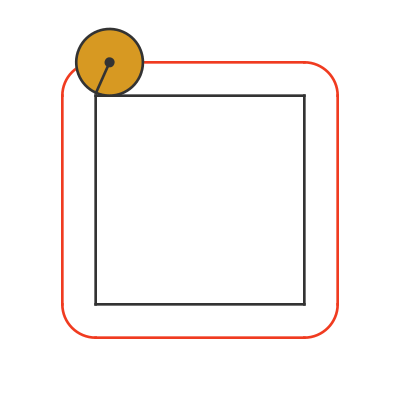 Красная линия показывает путь, который проходит центр монеты вокруг квадрата.