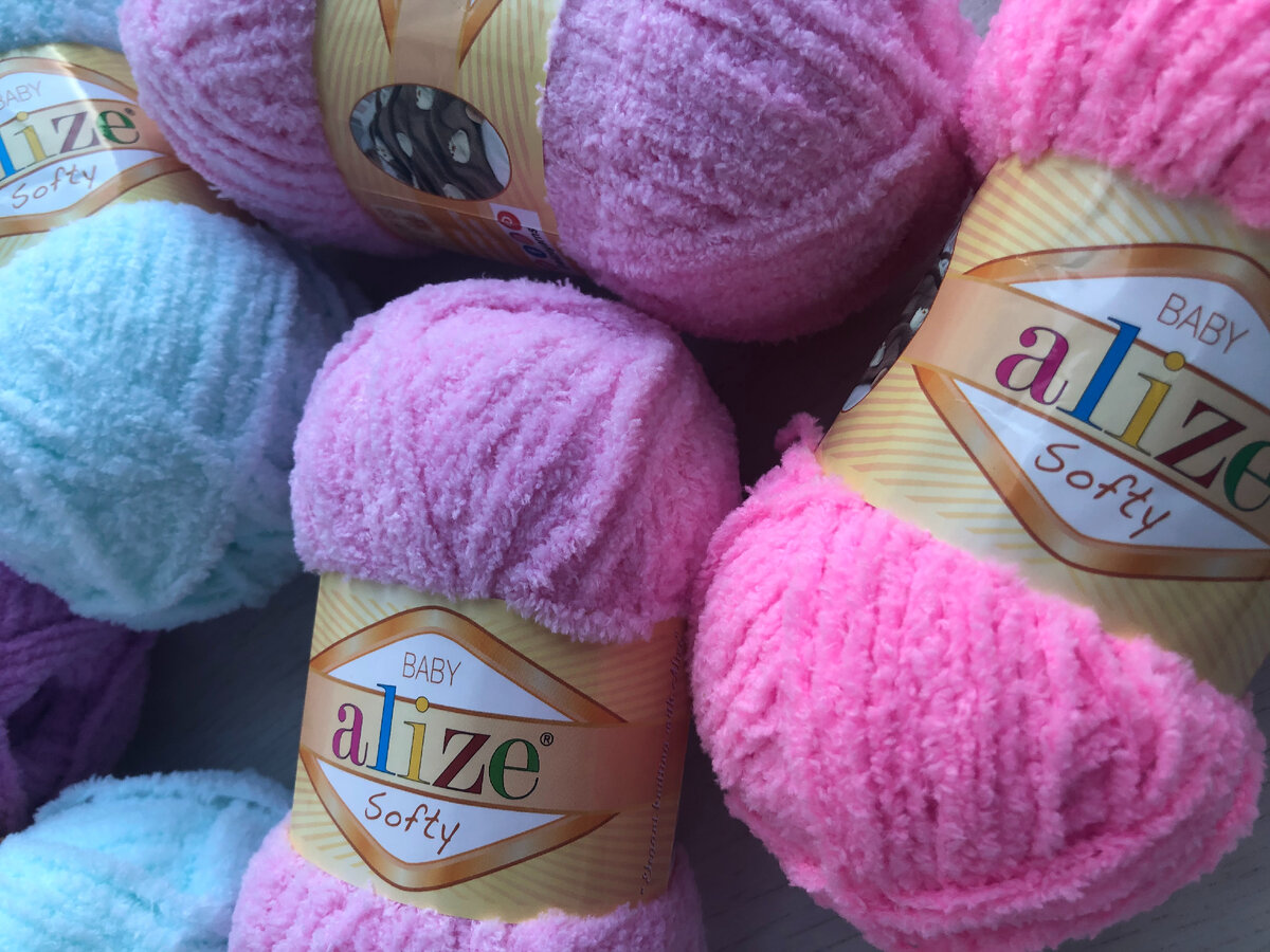 Состав любой плюшевой пряжи - 100% микрополиэстер, то есть синтетическое волокно. Несмотря на то, что это синтетика, и для многих это сразу отталкивающий факт, пряжа всё-таки имеет ряд преимуществ. Например по тактильным ощущениям она невероятно мягкая и нежная, не вызывает аллергических реакций, поэтому отлично подходит для вязания детям, также пряжа очень теплая, что тоже немаловажно. Мой фаворит среди плюшек - Alize Softy. Познакомилась я с этой пряжей лет так 10 назад. Это была любовь с первого взгляда. На тот момент я вязала в основном только крючком, поэтому стоит заметить, для крючка эта пряжа - настоящая пытка. Петель при вязании не видно от слова совсем, даже если используешь маркеры. Но результат, который в итоге получаешь, очень радует. При вязании спицами пряжа более податлива. Вязать намного проще, проблема в основном возникает при сшивании, хотя есть несомненный плюс- совершенно не видно ошибок. Сейчас фабрика Alize выпускает огромную палитру цветов, и цвета в основном о