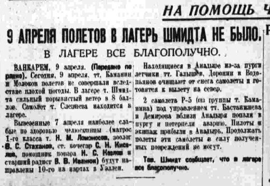 И никакой информации, что в этот день Молоков сделал три рейса на льдину и вывез 14 человек, включая Ушакова, Каманин сделал один рейс, забрал трех человек, и приступил в Ванкареме к ремонту самолета, Слепнев на льдине починил шасси и эвакуировал шесть человек. Все это посчитали неважным и в разделе «сообщений не было». Видать хотели сделать сюрприз в следующих публикациях. Посмотрим...