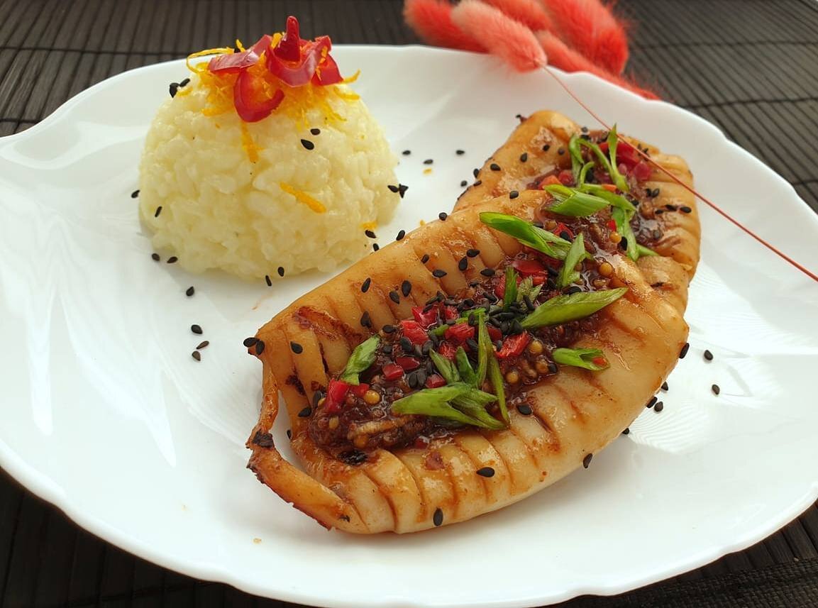 Выкладываем кальмаров на тарелку, сверху выкладываем соус-маринад. При желании посыпаем кунжутом, нарезанным перцем чили и зеленым луком. Я подавала кальмаровы с апельсиновым рисом.