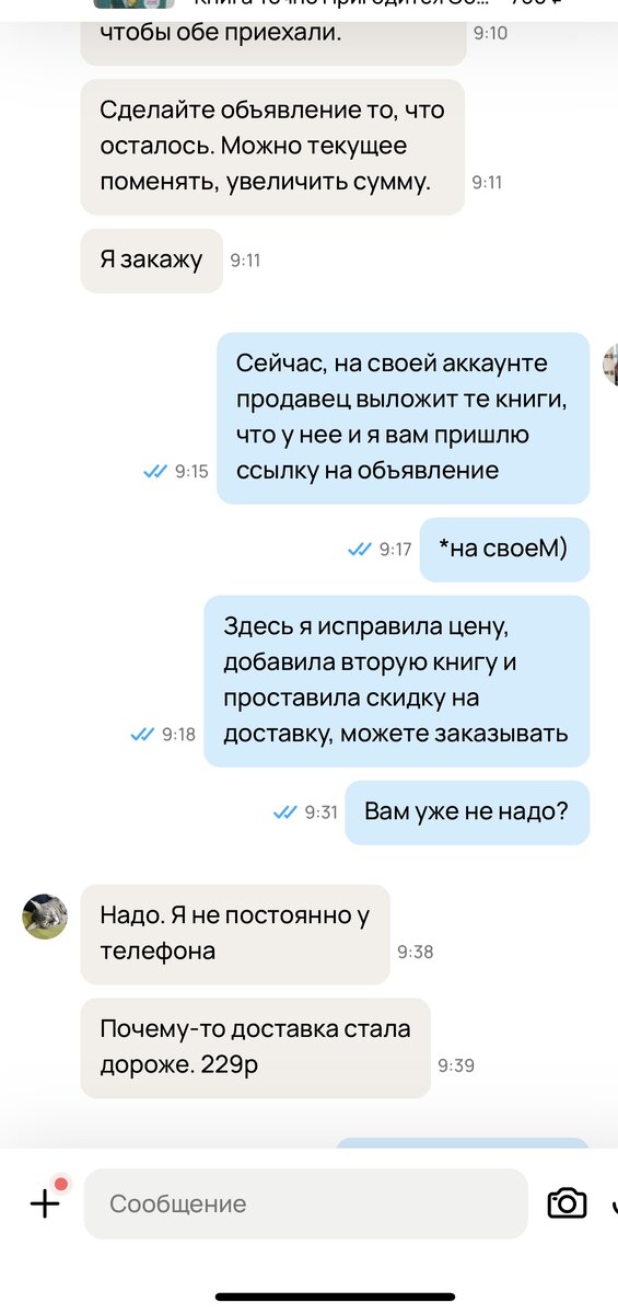 Сразу скажу, сумма обмана маленькая, но ситуация неприятная. И отличный опыт на будущее! Началось все с того, что подруга попросила выложить на продажу в моем аккаунте несколько книг, ибо она ранее никогда не продавала, на Авито отзывов на ее аккаунте нет. Тем временем у меня 12 положительных отзывов, заказы идут (ура!), люди мне доверяют (приятно!). Конечно, я согласилась помочь и разместила у себя несколько объявлений с ее товаром, указав ее адрес для самовывоза. Цены хорошие на опт (сразу 7 новых книг в схожей тематике). Однажды утром мне поступает 100500 сообщений от одного потенциального клиента, которая хочет и мои товары, и моей подруги с Авито-доставкой. Подруга живет достаточно далеко, почты у нас тоже разные, поэтому объединить в одну посылку все товары- не получится. С трудом удалось донести до клиента данную информацию. Вины покупателя нет, поэтому я предлагаю решение возникшей проблемы такое: Покупатель сама предлагает частичную предоплату по моим товарам, так как на