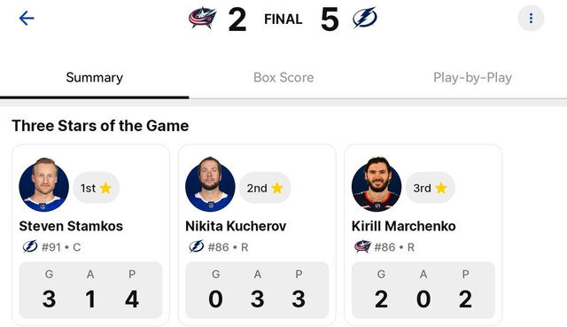 НХЛ признала 30-летнего форварда второй звездой поединка с «Блю Джекетс», по итогам которого «Лайтнинг» победили с комфортным преимуществом в 3 шайбы.