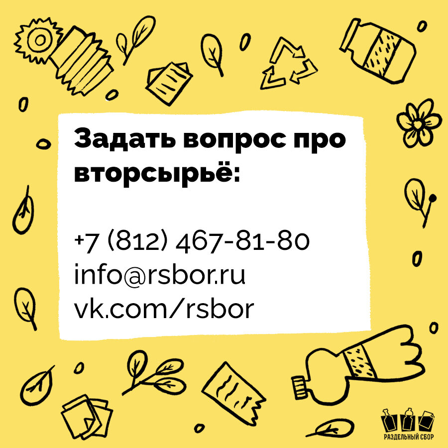 «Я всё думала — как правильно поступать с отходами, и вот вселенная послала мне ваш телефон», — так сказала одна из позвонивших нам жительниц Петербурга. Если вы тоже ждёте знака, то вот он: у «РазДельного Сбора» есть служба поддержки, специалисты которой готовы ответить на любые вопросы про вторсырьё. Задать вопрос можно по телефону +7 (812) 467-81-80, по почте info@rsbor.ru или через сообщения в наших соцсетях. Если вы не знаете, что куда сдавать, как снизить количество отходов, можно ли требовать продажи продуктов в свою тару или как внедрить раздельный сбор в офисе — обращайтесь, мы подскажем. 👉 А ещё — расскажите друзьям о возможности задать «РазДельному Сбору» любой вопрос про отходы и экологичный образ жизни. Пусть на экопути будет как можно меньше препятствий. Просто поделитесь этим постом! Задать вопрос можно по телефону +7 (812) 467-81-80, по почте info@rsbor.ru или через сообщения в наших соцсетях. Иллюстрация: Анастасия Кувшинова