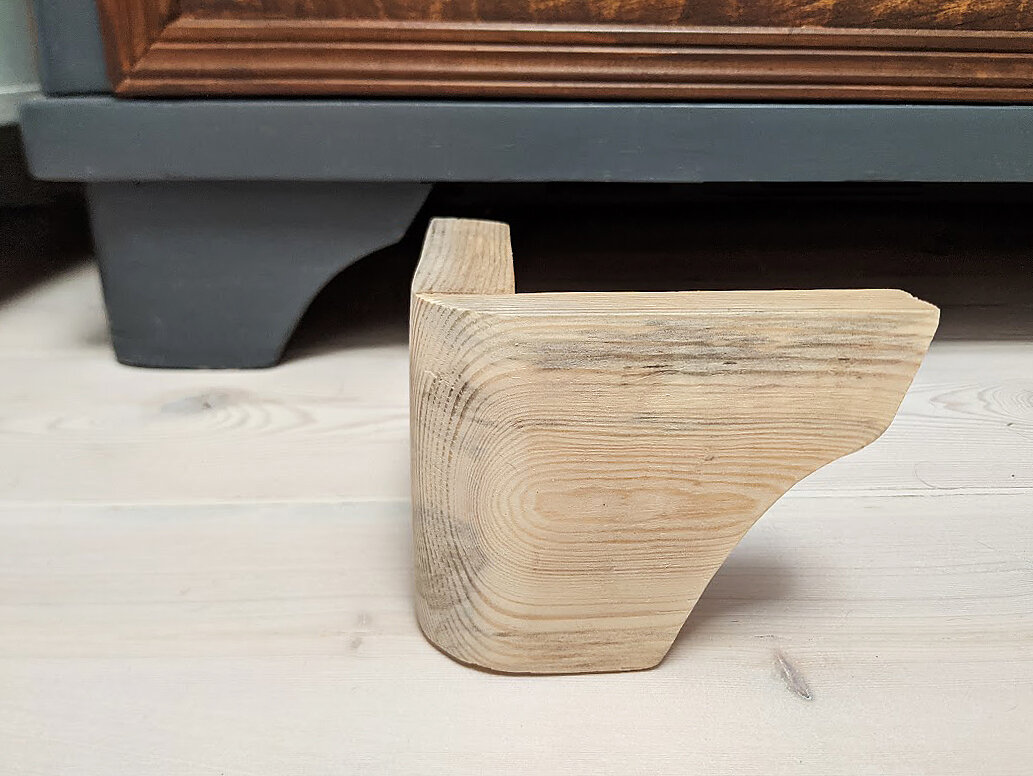 Пришло мне в голову сделать ножки как на старых комодах. Рассчитала, напилила заготовок из дюймовой доски. Доски лежат уже четыре года, остались от черновой подшивки потолка на втором этаже. Хорошо просохли, и вот пришла их пора. Хотелось пропилить четко под прямым углом, но в стусло доска не влезла. Поэтому придумала такую замысловатую конструкцию. Получилось действительно ровно. Сложила детальки, проверила уголком. Затем стала думать, как сделать скругление? Болгаркой пыльно, да и не факт, что будет ровно. Как альтернатива ножовка и напильник. Сделала два пила, потом сровняла напильником. Пойдет! Интересно, как раньше делали? Теперь полукружия. На ум пришло два способа. Второй вариант - пилить. Пришлось брать лобзик в руки... первый раз. Раньше избегала этого инструмента, потому что муж и дочь прекрасно им владеют. И всегда кто-то рядом, и можно переложить в надежные руки эту дребезжащую штуковину. Но не сегодня ( Первый пил вышел на удивление ровно. Но на этом моя удача закончилась