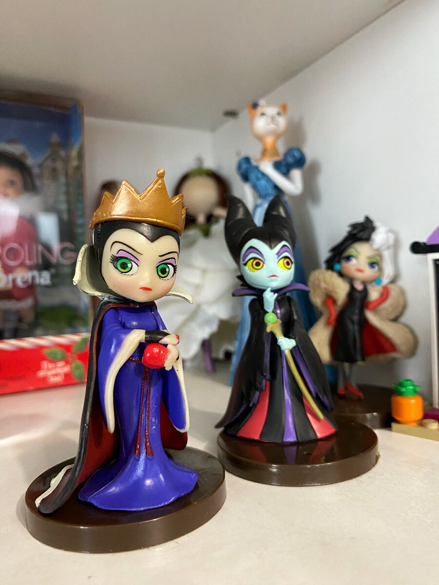…если честно, я не большой любитель всяких фигурок. Не собираю ни Funko Pop, ни каких-либо других. В кукольном шкафу, правда, выделена полка «под мелочь», и туда селится все маленькое, что я периодически хватаю на Алике или российских маркетплейсах. И до последнего времени там творился некоторый хаос, жители стояли как попало и не просматривалось вообще никакой системы. Но сегодня на полку заехали новенькие - сразу три диснеевские злодейки. И все поменялось просто в мгновение ока.