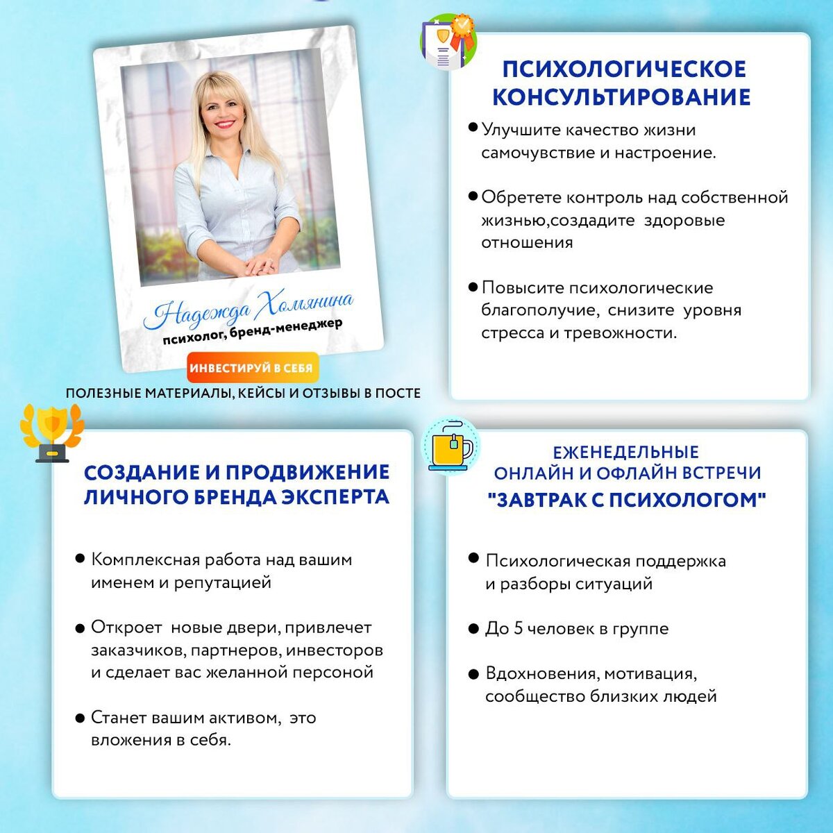 Приветствую, дорогие друзья! Меня зовут Надежда Хомянина и я оказываю психологическую помощь, если вам нужна поддержка на дороге жизни, а также помогаю в профессиональной реализации. 🔸За 15 лет мною проведено более 3000 консультаций. 🔸 Более 50 проектов "под ключ" и не только. Это всё, невозможно без соответствующего образования. 🔸Дипломы MBA и Академии права и управления МЮ. 🔸Также я являюсь сертифицированным тренером и психологом. 🔸Выпускница Президентской программы "Развитие предпринимательства в России" и это еще не все. 💯Я постоянно обучаюсь и повышаю свою квалификацию. 🦸Моя миссия заключается в том, чтобы помочь вам занять свое место в современном мире и раскрыть ваш потенциал на максимум, выявить вашу уникальность, выделить ваши сильные стороны, ключевые компетенции и начать двигаться к поставленным целям. Я готова поддержать вас на этом увлекательном пути, полном открытий и достижений. 💎 Подробнее о моей истории можно узнать здесь: https://t.me/Solntzenadezdahomyanina/2