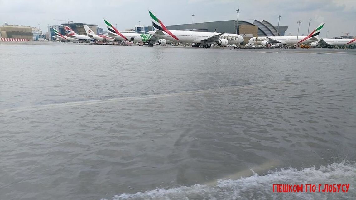 Во вторник 16 апреля в Дубае произошло сильное наводнение после того, как за один день выпало больше осадков, чем обычно бывает за целый год. Дороги превратились в реки, а вода затопила дома и предприятия. На фото видно, как международный аэропорт Дубая, недавно названный вторым по загруженности аэропортом в мире, оказался под водой. Большие самолеты больше напоминали лодки, двигаясь по залитому водой асфальту, а волны разбивались о корпуса машин. Перебои в работе аэропорта продолжались до среды, подъездные пути были перекрыты наводнением. Многие авиакомпании, в том числе флагманская авиакомпания Emirates, сообщили о задержках рейсов. Бюджетная авиакомпания Flydubai отменила все рейсы до 10-00 среды по местному времени. Пассажиры, которые застряли в аэропорту, рассказывают, что они провели там ночь после прибытия во вторник вечером, потому что не было возможности добраться до терминала. По данным ООН, всего за 12 часов во вторник выпало почти 100 мм дождя, что эквивалентно годовому кол
