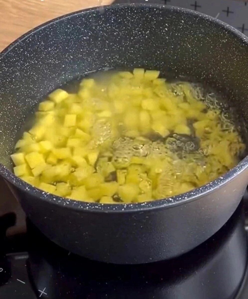 Для начала нарежьте картофель на маленькие кубики и положите его в кастрюлю для тушения. Немного посолите и дайте картофелю немного провариться.
