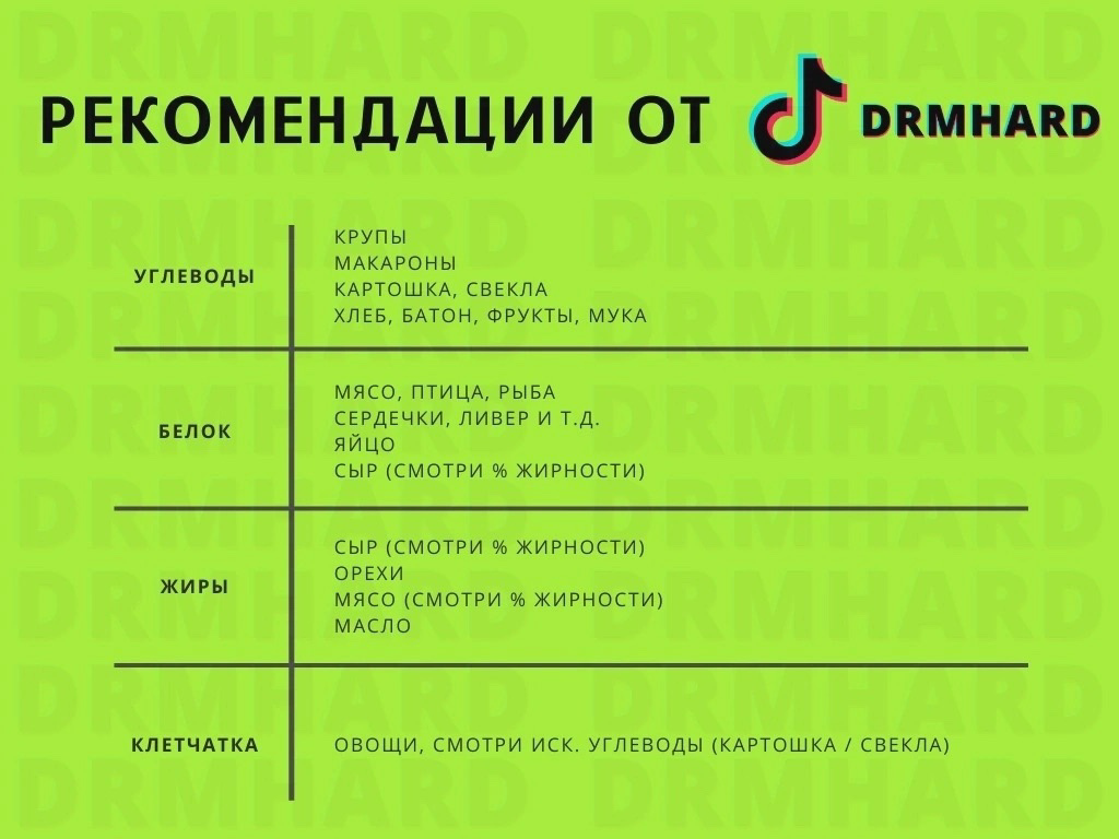 Начнём с того, что на эту тему есть видео лекция. Я придерживаюсь питания по сочетанию БЖУ без подсчета калорий, лекция доступна так же в ВК и на канале Дзена (тык). Все мы по разному воспринимаем информацию, возможно в виде статьи будет легче воспринимать информацию. Преимущество питания: не надо готовить себе отдельно и считать калорийность. У меня 4-ех разовое питание: 3 основных приёма пищи и 1 перекус. У каждого продукта есть основной нутриент (превосходящий), то есть повышенное содержание белка, углеводов или жиров. То есть, для того чтобы правильно питаться следует понимать просто Какой продукт что представляет. Я думаю все же в курсе, что: мясо, рыба - белок гарниры, хлебобулочные- углеводы орехи - жиры Овощи - клетчатка И я думаю все прекрасно знаю правило здоровой тарелки. Соответсвенно у нас получаются следующие основные приемы пищи: завтрак: белки, жиры, углеводы и клетчатка обед: белки, жиры, углеводы и клетчатка ужин: белки и клетчатка (может быть малая часть жиров) С