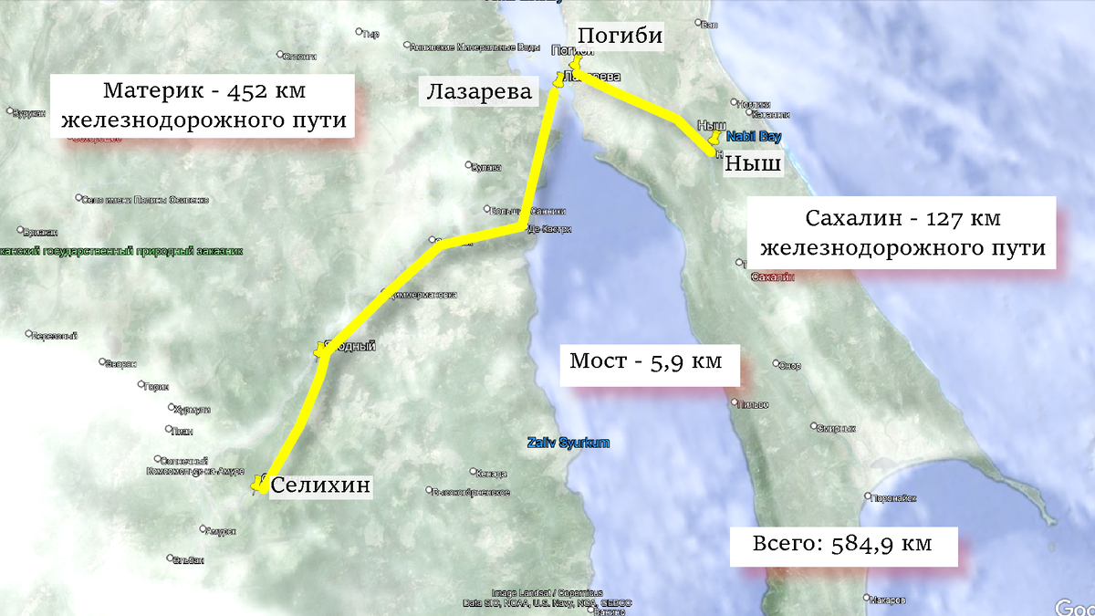 - собственно, 6-километровый мост через пролив Невельского между материковым мысом Лазарева и сахалинским Погиби,