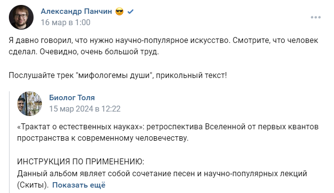 Скит — дополнительная научная база, которая поможет глубже понять смысл песни. Подготовьтесь к удивительному путешествию сквозь время и пространство! Научно-популярное искусство О данном альбоме я получил приятный отзыв от одного из моих любимых популяризаторов науки - Александра Панчина. Я давно говорил, что нужно научно-популярное искусство. Смотрите, что человек сделал. Очевидно, очень большой труд.