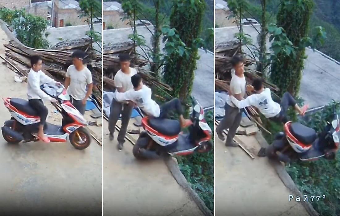 Двое молодых людей, проживающих в сельской местности провинции Сычуань совершили незапланированные ими падения со склона, произошедшие по вине владельца электроскутера.