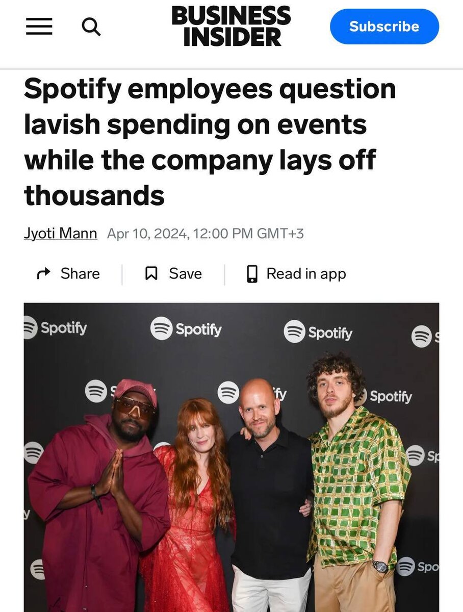 Spotify устроили роскошный корпоратив с вечеринкой, а через 4 дня уволили 1500 сотрудников.