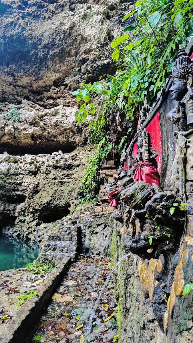 Kelingking Beach. В 40 минутах от пляжа был поворот и спуск к побережью. Уже по гугл картам было понятно, что дорога не будет простой. По пути нас ждала проселочная дорога с крутыми спусками и фактически буреломом вместо дороги. Когда мы проезжали поселок, то местные бомбилы пытались нам объяснить, что на своей ямахе мы ни за что не доберемся, застрянем и потащимся за помощью. Мы решили все же попробовать, хоть и вид перепадов высот нас немного напряг. Супер крутой спуск по тонкой проселочной дороге. Где то я слезала и шла пешком. Эту дорогу можно назвать экстремальной, но проходимой). Добравшись вниз мы увидели толпу бомбил, которая отдыхала у храма и ждала бедолаг, которые их послушали и оставили свои байки в поселке. Оплата за дорогу туда-обратно и ожидание. Целая бизнес схема). Пройдя через тысячелетние высокие живые джунгли мы вышли к священным источникам. Из одного мы набрали воды и умылись. Пройдя даль