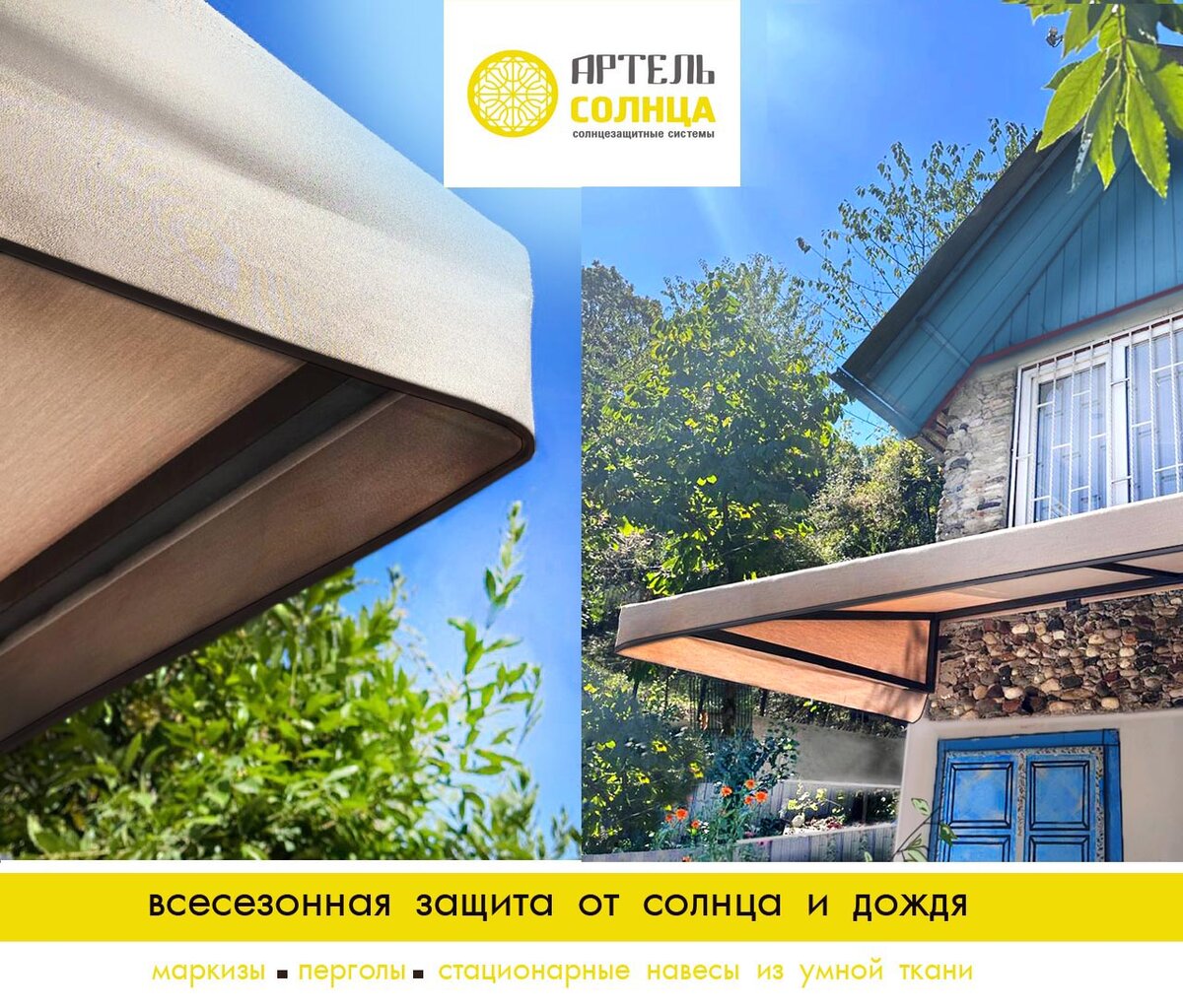 Тканевые навесы, это современно, эстетично и доступно. Когда хочется защититься от непогоды и слишком палящего солнца, но отнестись к делу со сбережением бюджета — навес из акриловой ткани станет отличным решением. Они были разработаны нами специально, как доступная, но привлекательная внешне и практичная альтернатива Под навесом будет уютно в непогоду и прохладно в жару, умная ткань сохранит комфортную температуру на вверенном участке, защитит от жары и осадков, не потеряет цвет на солнце и не деформируется под воздействием ветра и дождя. Кроме того – они не создают парникового эффекта, не гремят под дождём и создают приятную прохладу под своим тканевым пологом. А чтобы вы смогли выбрать нужный оттенок ткани, мы бесплатно приедем на ваш объект с каталогами. Со своей функцией навесы справляются на ура и выглядят достойно. Современные, лёгкие, элегантные, надёжные и очень красивые – они практичны и станут достойным дополнением фасада вашего дома или заведения. Предлагаем пройти на