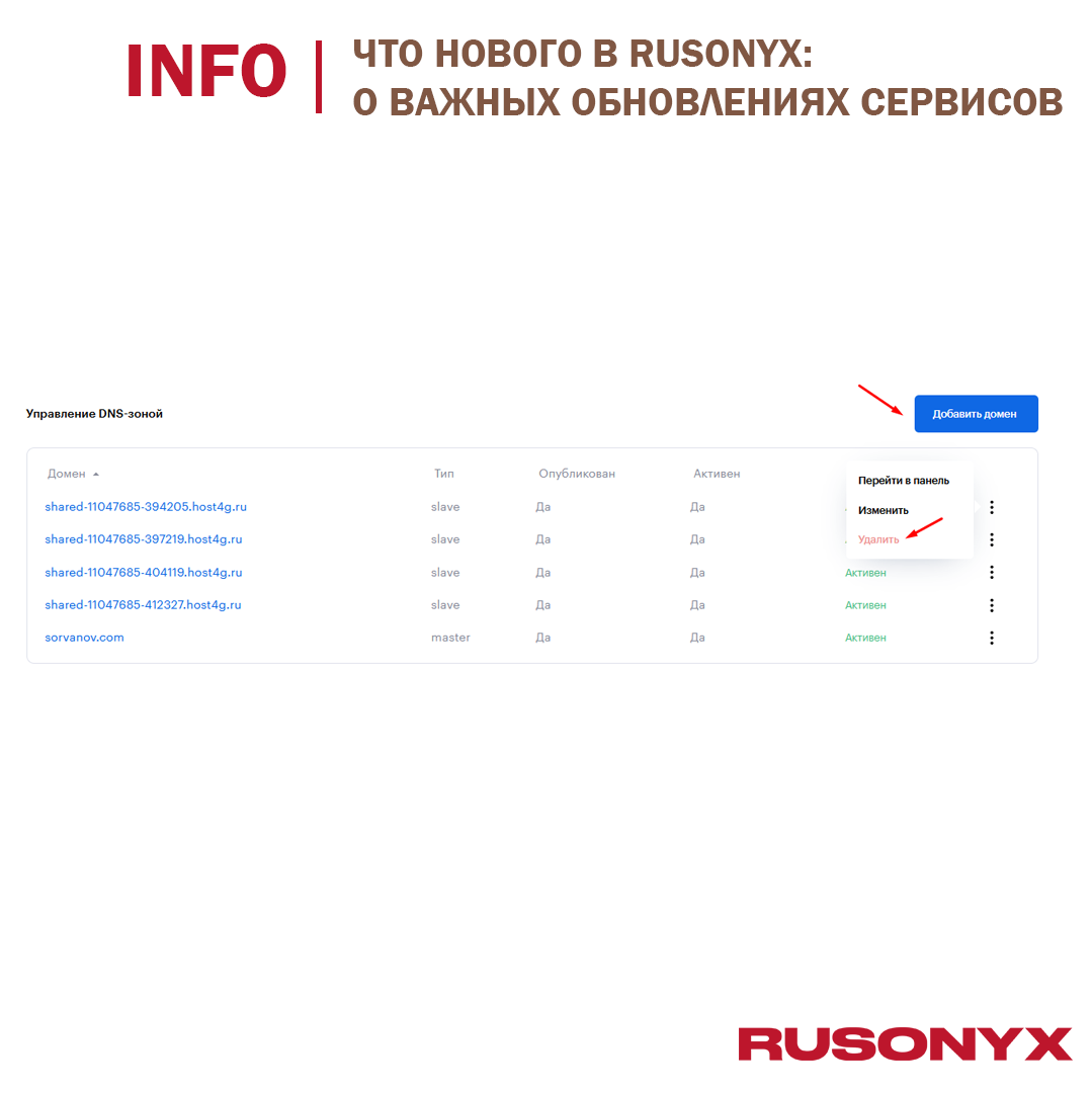 Продолжаем делиться актуальными и полезными изменениями в работе наших сервисов: ✅ Для вашего комфорта при удалении/добавлении домена в "Управление DNS-зоной" список текущих доменов обновляется автоматически. Необходимость в вручном обновлении страницы устранена