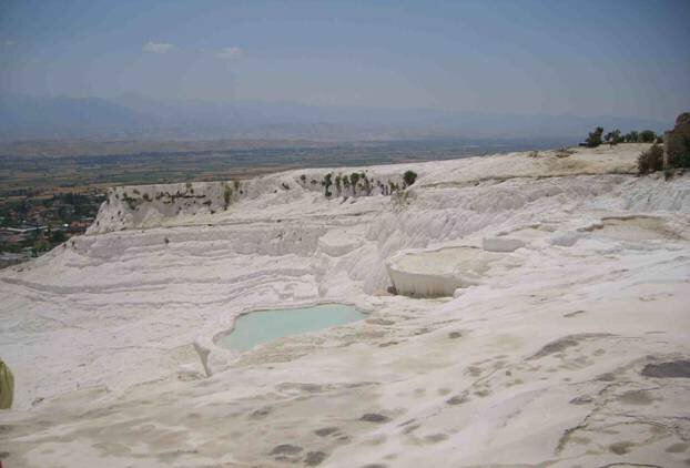 Часть первая. Обувь, футбол и медовый месяц Часть вторая. Дорога до Памуккале. После сытного обеда, по закону Архимеда, полагается…Ну вы знаете, что полагается после хорошего приёма пищи. Но к сожалению в Турции, на экскурсии в Памуккале, вас повезут купаться в бассейне, смотреть амфитеатр и музей, а так же ходить босиком. Но всё по порядку. По приезду, гид довёл нас до бассейна Клеопатры и объявил: -там бассейн, платите купайтесь, там амфитеатр, идите смотрите, там музей, идите просвещайтесь, там травертины, снимайте обувь, наслаждайтесь, у вас столько то времени. После чего помахал всем ручкой и ушёл. Увидев небольшую лужу, гордо называемую бассейном самой Клеопатры и огромное количество людей, желание платить и бултыхаться в газировке, отпало само собой! Погуляв у бассейна, попив водички минеральной, и посмотрев на людей, пытавшихся найти свой свободный пяточёк в бассейне, мы пошли в амфитеатр. Там, любимая вспомнила свой Питерский опыт, под названием «экскурсия на халяву» и пред