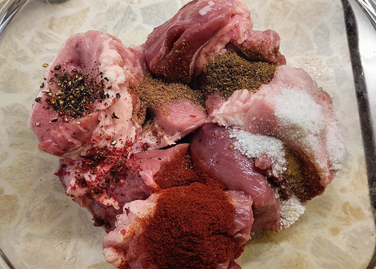 100 мл. Вода Мясо режется крупно, примерно куски по 5 см. Засыпаются специи, соль, вода, всё перемешивается. И складывается в форму для запекания с крышкой. Форма ставится в духовку на 180 градусов на 3 часа. Если форма стеклянная, то духовка должна быть изначально холодной и температура прибавляется постепенно. По истечению времени достать из духовки. Всё разломать на волокна, перемешав с оставшимся соком. Сок должен впитаться в мясо. Такая свинина идеально подходит для бутербродов, пиццы и просто покушать с макаронами или крупами, как с тушёнкой.